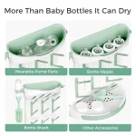 About this item: 1. **Large Adjustable Capacity**: This versatile baby bottle drying rack holds up to 18 bottles and nipples. Its customizable DIY design allows you to arrange components based on your daily feeding routine, ensuring efficient drying while keeping your countertop organized and clutter-free. 2. **All-in-One Drying Solution**: Eliminate accessory clutter with dedicated spots for nipples, pump parts, bottle caps, and a separate area for brushes. Everything stays neatly in place, dry and ready for the next feeding session, making this organizer a practical addition to any nursery or kitchen. 3. **Safe Materials & Efficient Drying**: Constructed from BPA-free, food-grade plastic for complete peace of mind. Features include a built-in drainage slot and ventilated backboard that minimize water accumulation and enhance airflow, promoting quick drying of bottles and accessories. 4. **Space-Saving Design**: Optimize your counter space with this compact drying rack (14.53″ x 6.77″ x 16.14″ inches when fully assembled). It neatly stores all baby bottles and essentials, helping maintain a tidy and organized feeding area without taking up excessive room. 5. **Easy Assembly & Portability**: No tools required—simply snap the components together in minutes for quick setup. Equally easy to disassemble for thorough cleaning or flat packing during travel. Its portable design makes it ideal for on-the-go families seeking convenience. 6. **Versatile Use**: Suitable for various baby accessories including bottles, nipples, breast pump parts, and more. The adjustable layout accommodates different sizes and types of items, ensuring flexibility as your needs evolve. 7. **Durable Construction**: Made from high-quality materials designed to withstand regular use while maintaining stability and functionality over time. 8. **Hygienic Maintenance**: The detachable parts facilitate easy cleaning under running water or in dishwashers (check specific guidelines), supporting proper hygiene practices essential for baby care products.