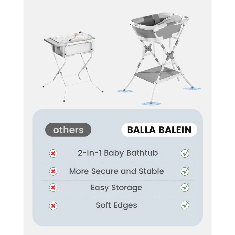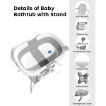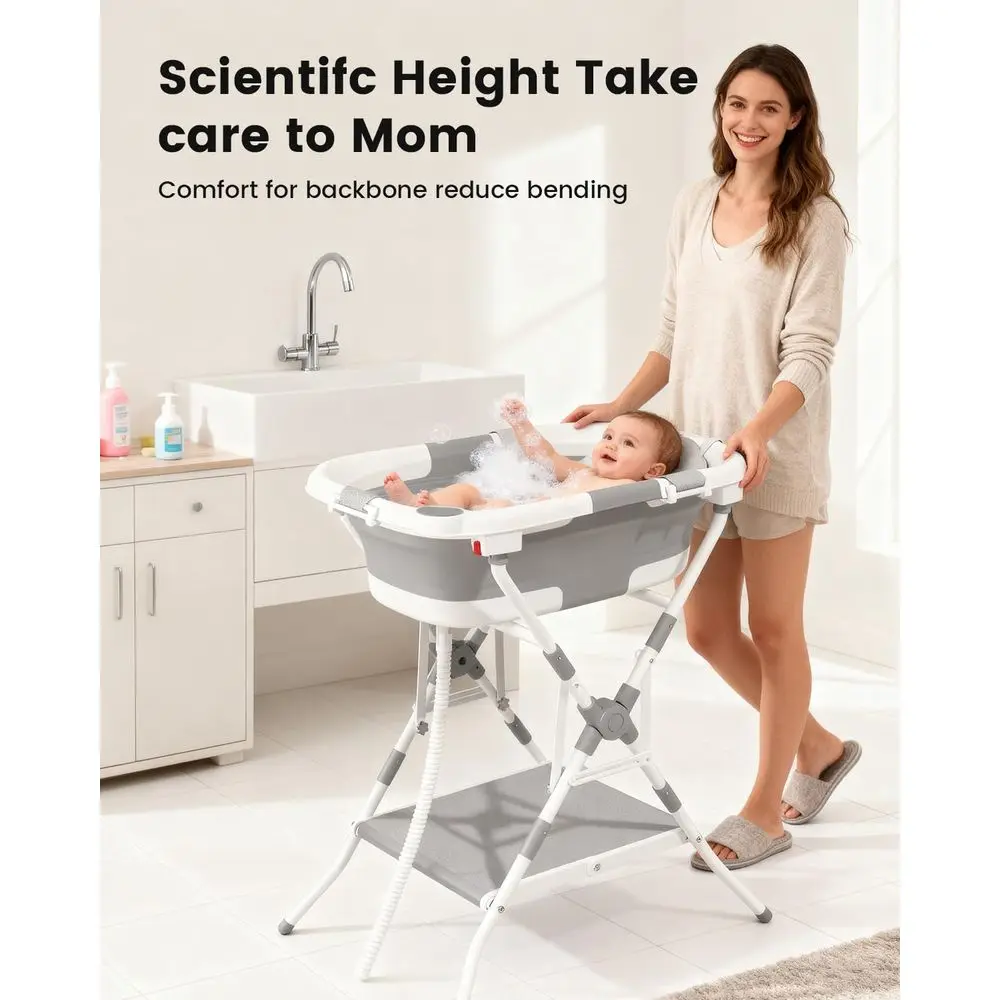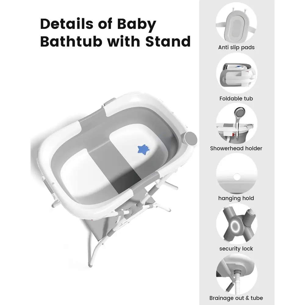 The baby stand bathtub features a collapsible stand made from high-strength materials, with four non-slip feet for stability. Its upper and lower triangular structure enhances durability, reducing the risk of bending or tipping over. The design ensures a safe and comfortable bathing experience for both baby and parents.