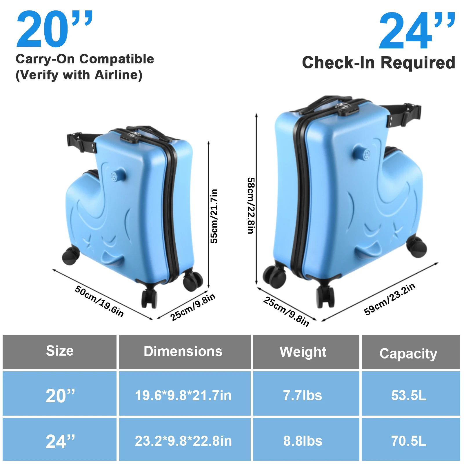 5. Recommended age: 20-inch suitcase is suitable for children aged 3-6. 24-inch suitcase is suitable for children aged 6-12.