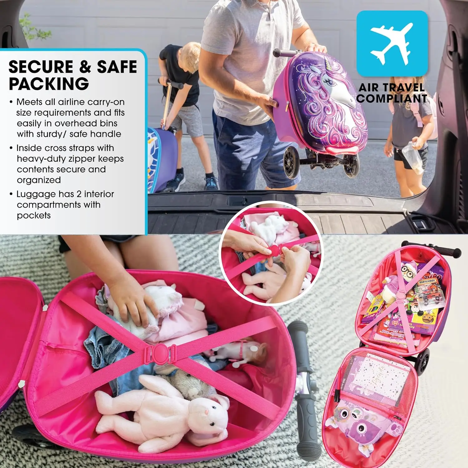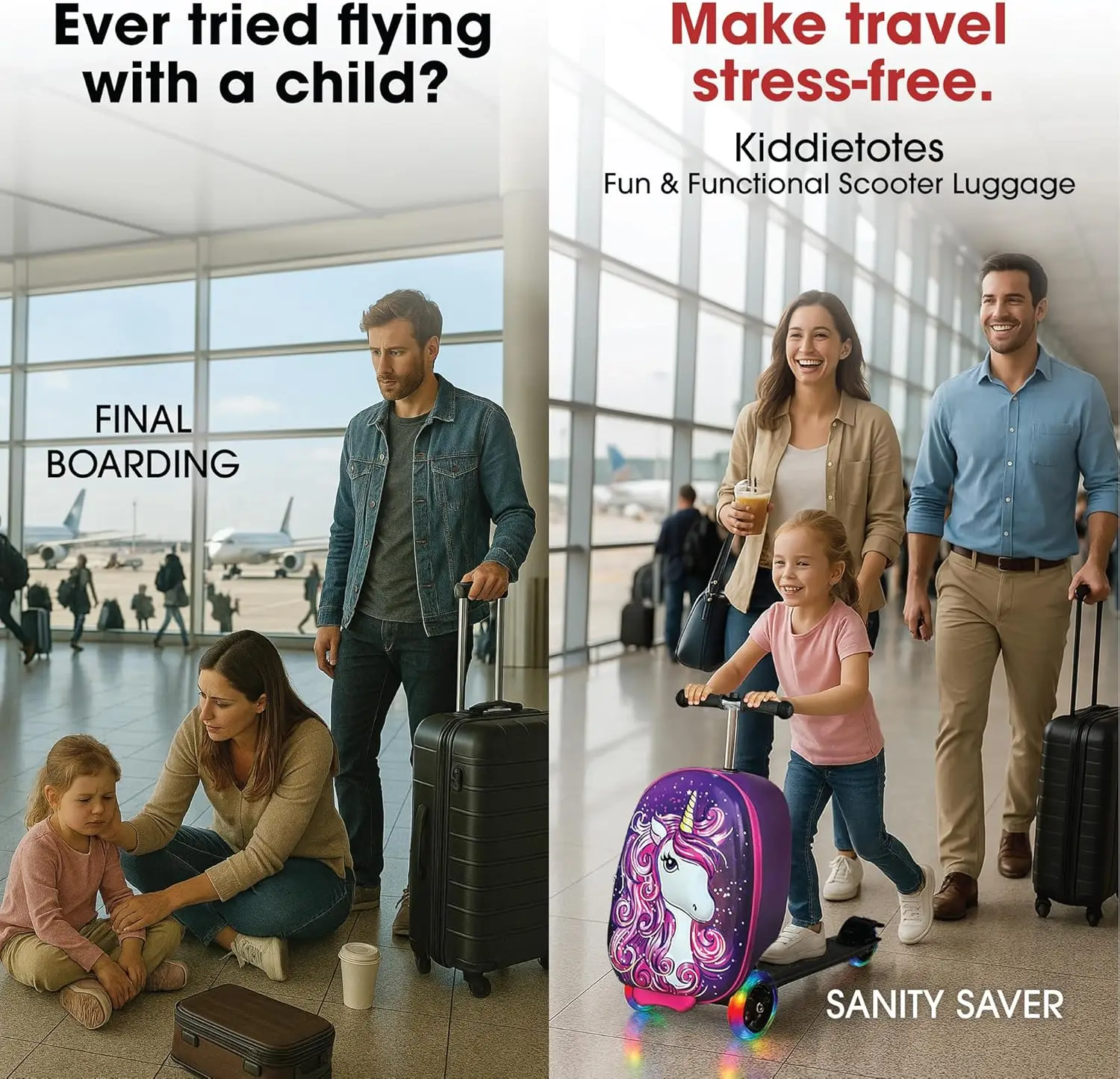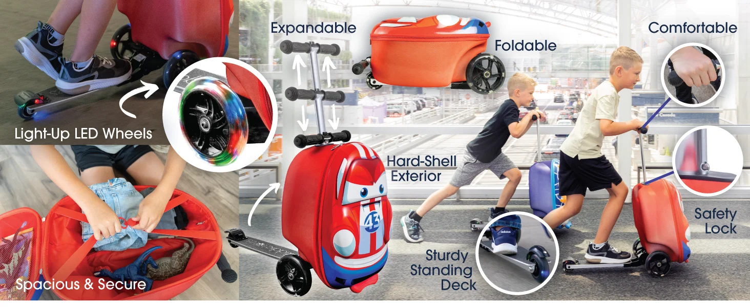 Watch Scooter Luggage in Action | Kids and parents alike love to use kiddietotes! Spacious capacity and durable construction will keep parents happy, while their kids are thrilled to zoom around town or the airport with all of their essentials along for the ride.