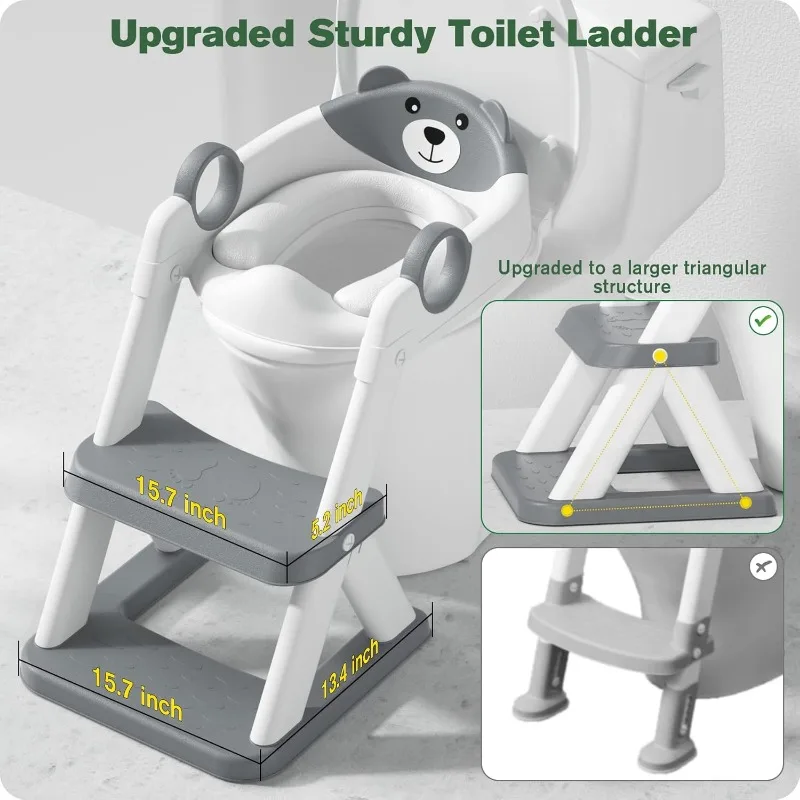 Upgraded Version : We’ve improved our toilet step stool by creating a sturdy triangular structure that’s designed to support children as they climb. Plus, we’ve widened the stepping surface to 15.7″x5.2″, providing more space for children to turn around and eliminating any fear they may have of climbing.